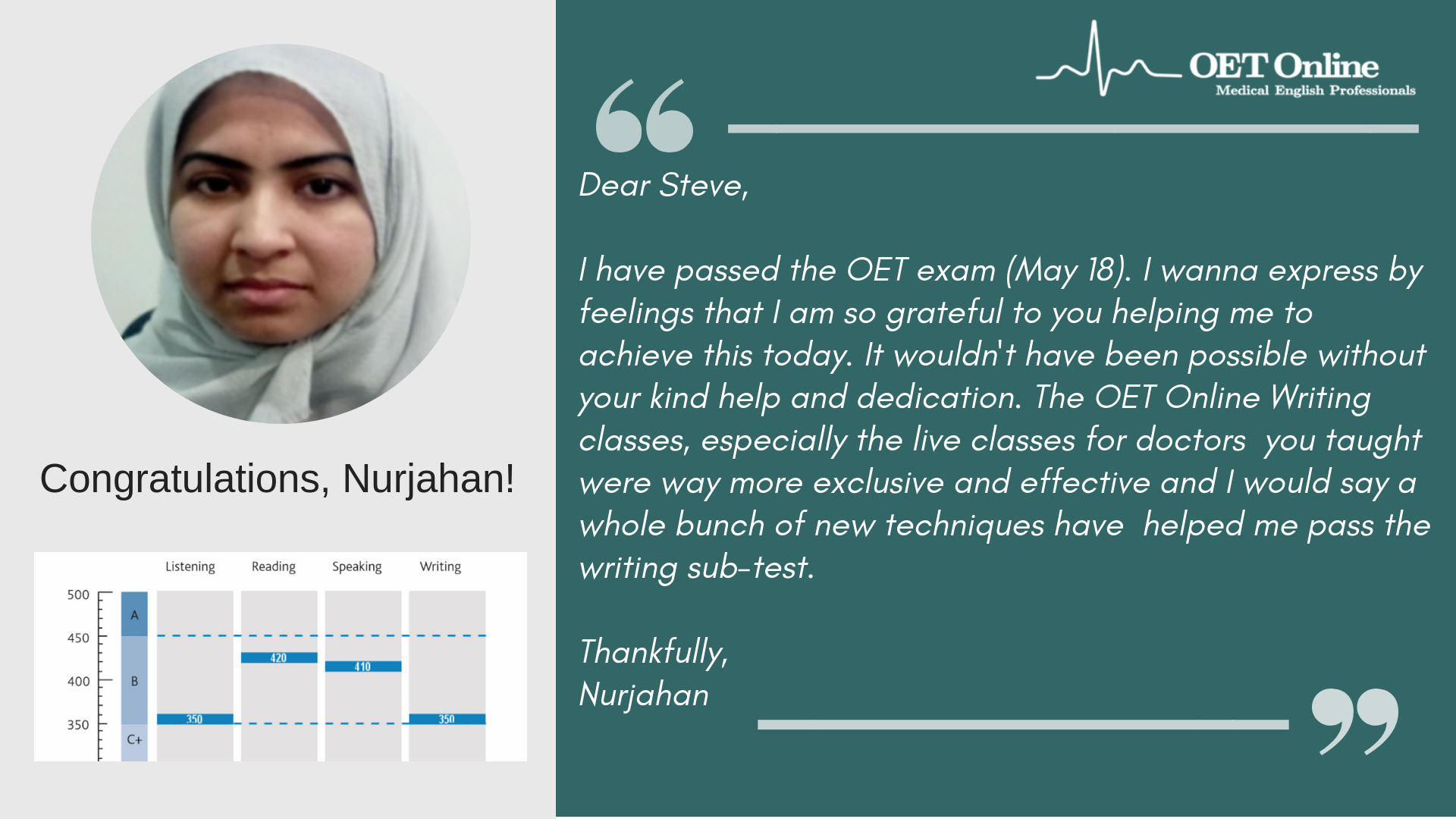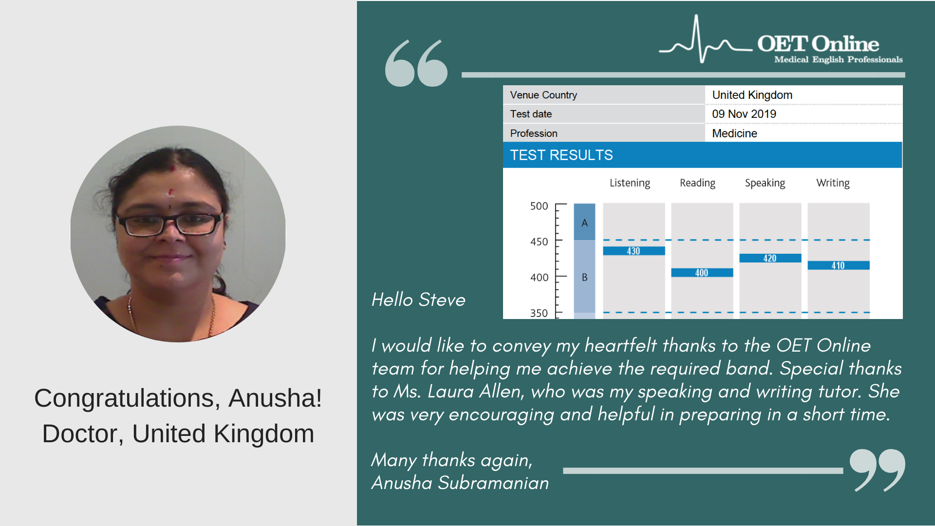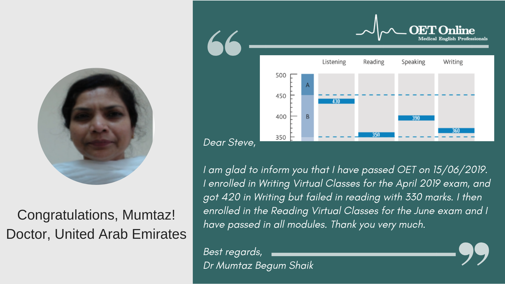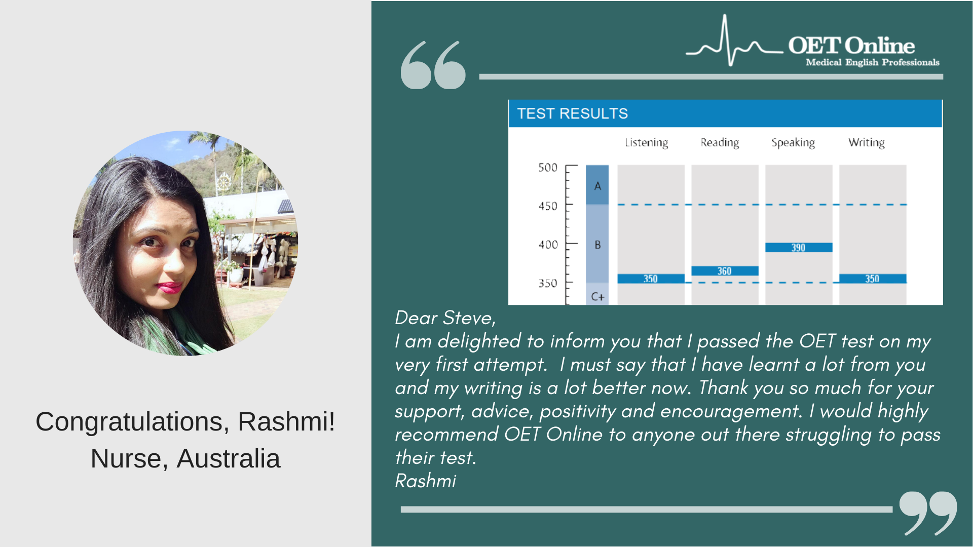 Hi Steve, I am writing to express my gratitude to you and your teaching team for helping me in achieving B scores in my OET exam. This could not have been possible without the guidance and support from the OET online team. The classes I attended not only helped me achieve the desired score, but it has also helped me overcome lots of flaws with regard to my English language skills. I would highly recommend OET online to everyone who is planning to take the OET exam. Thank you once again.