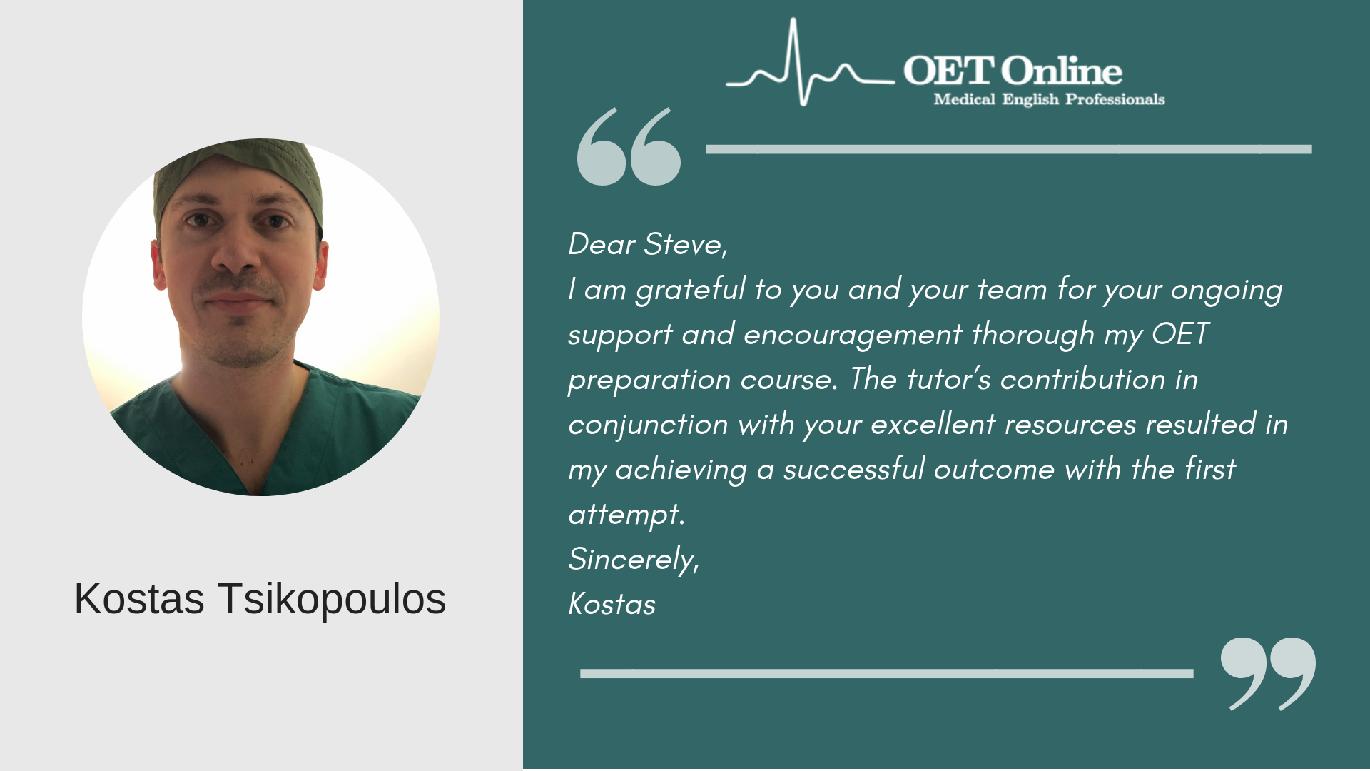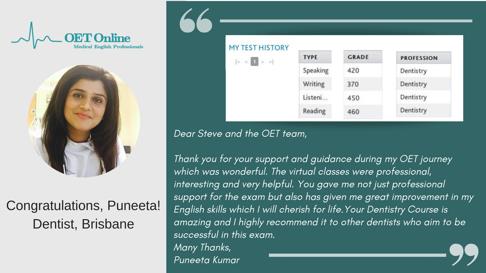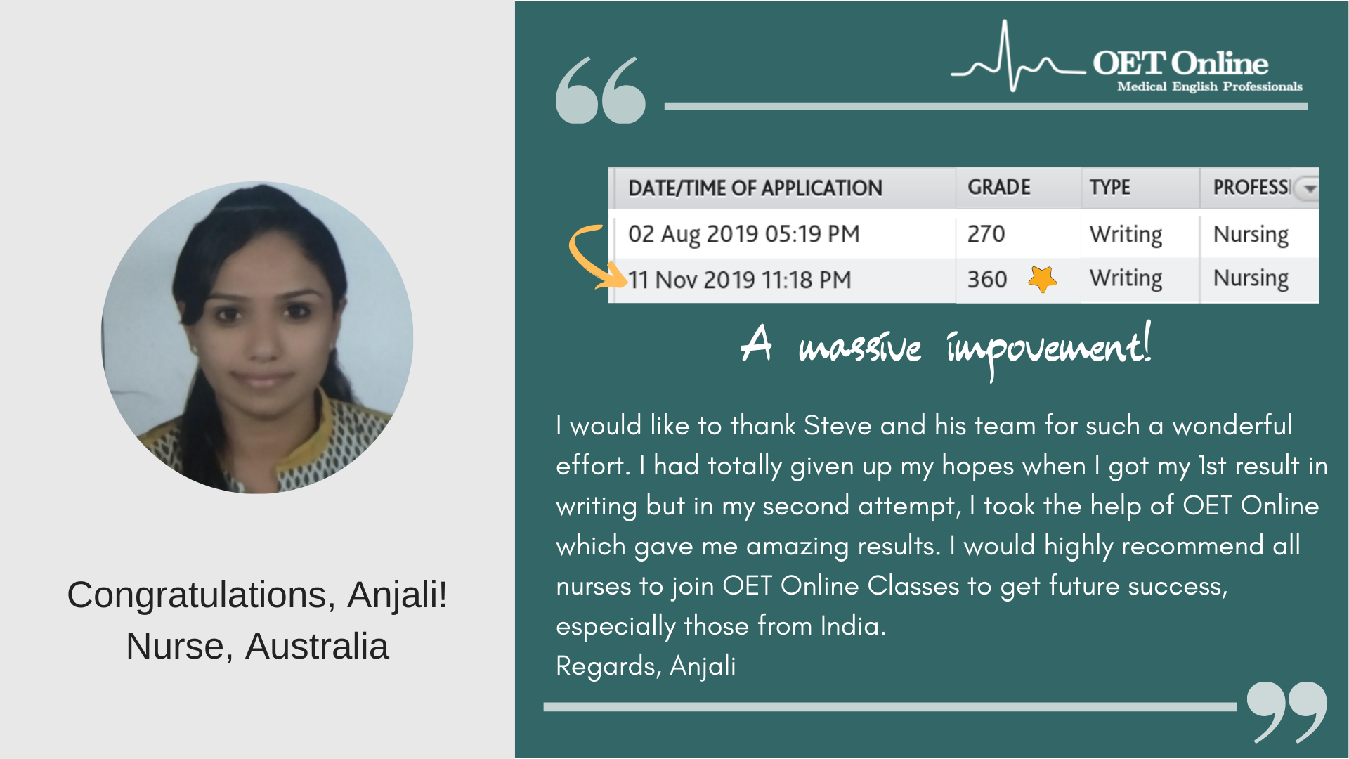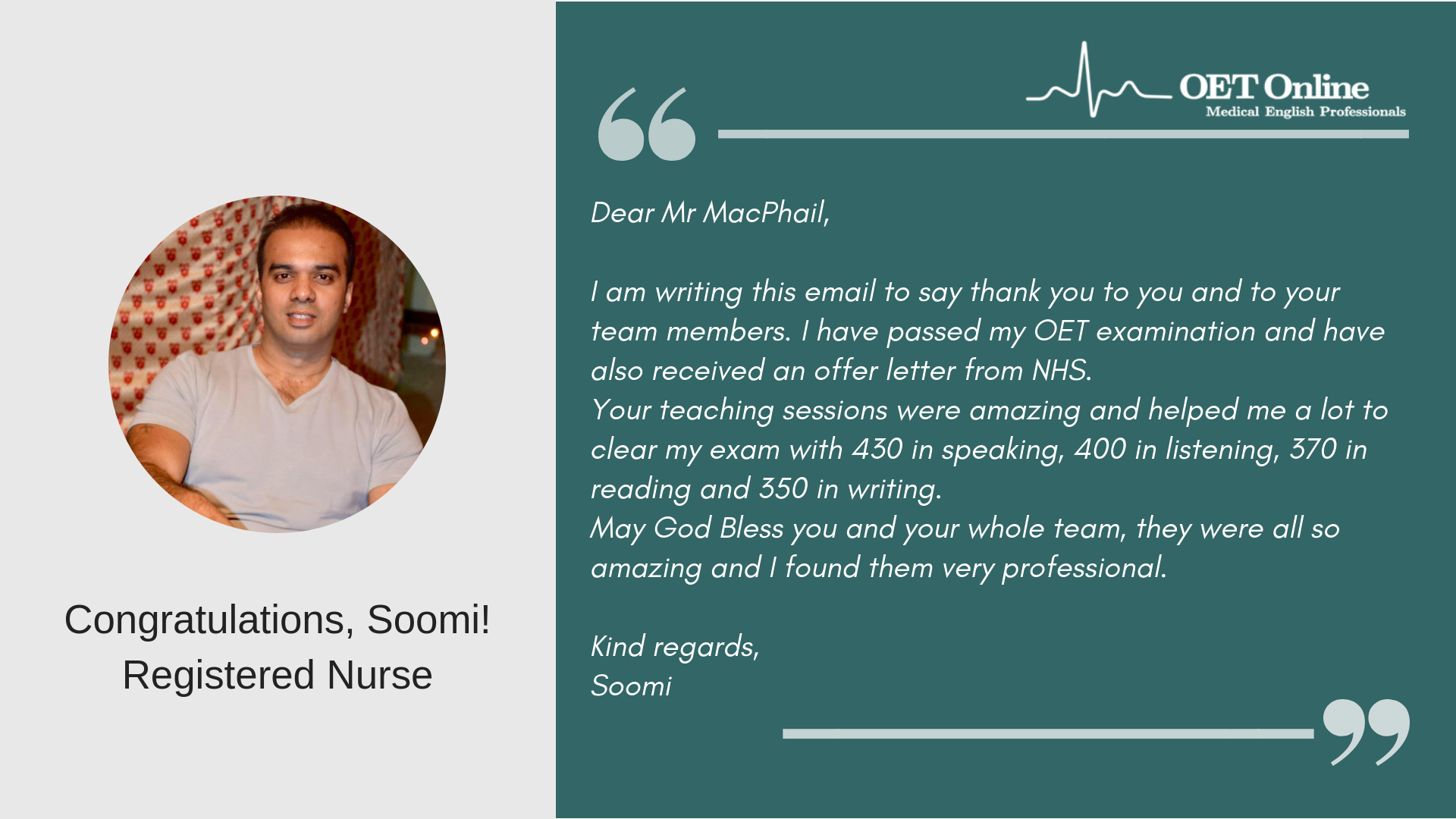 Hi Steve, I am writing to express my gratitude to you and your teaching team for helping me in achieving B scores in my OET exam. This could not have been possible without the guidance and support from the OET online team. The classes I attended not only helped me achieve the desired score, but it has also helped me overcome lots of flaws with regard to my English language skills. I would highly recommend OET online to everyone who is planning to take the OET exam. Thank you once again.