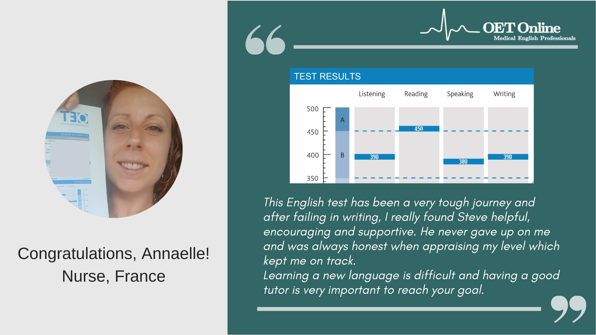 OET Online, being around for more than a decade, have mastered the strategies how to deal with the exam (even if it's 2.0 ). I would say, the skill building tasks and the study materials are worth every penny. I enrolled a month before the test day and gladly got all Bs in my first attempt. To Sir. Chris, my speaking and writing tutor, for being an incredible coach and for his serious efforts to help me prepare for the exam, Thank you for being an A+ teacher! I got 410 in speaking and writing. And of course, Sir Steve and Sir Gavin and the whole team behind those practice tests.