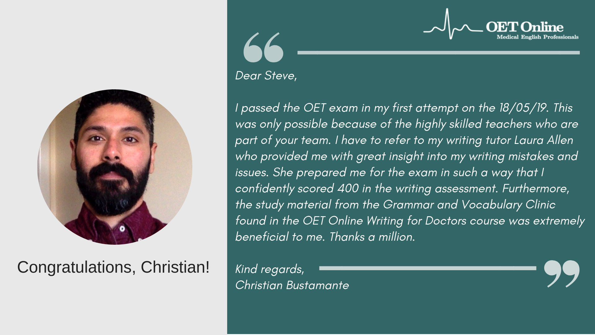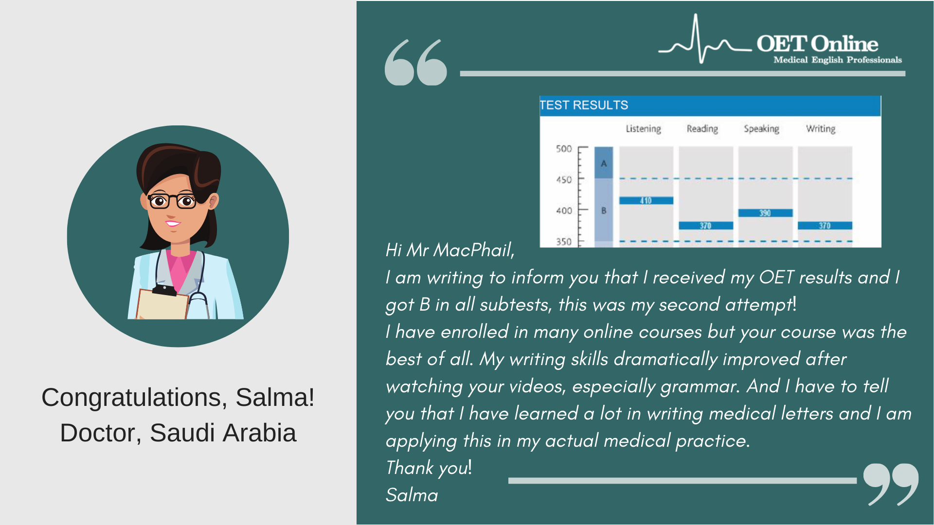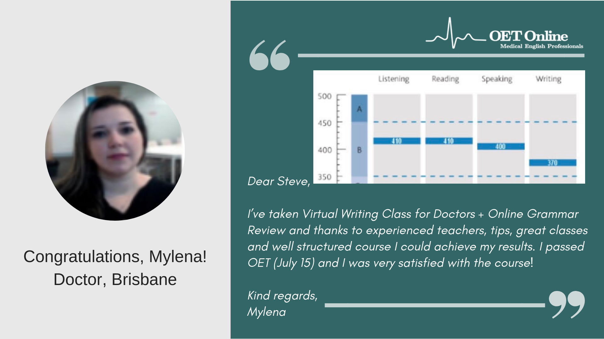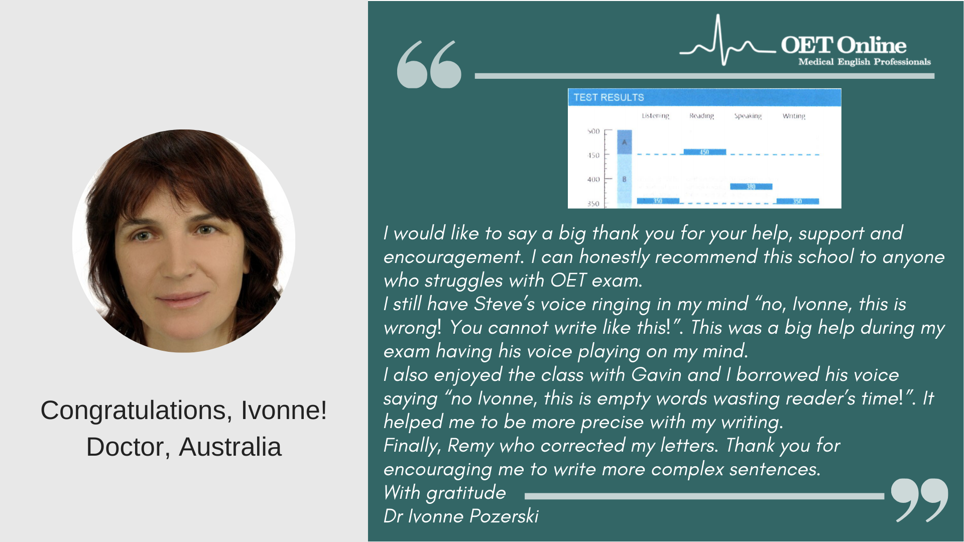 I would like to thank you and OET Online once again for the thorough training that I received face-to-face and online for writing.