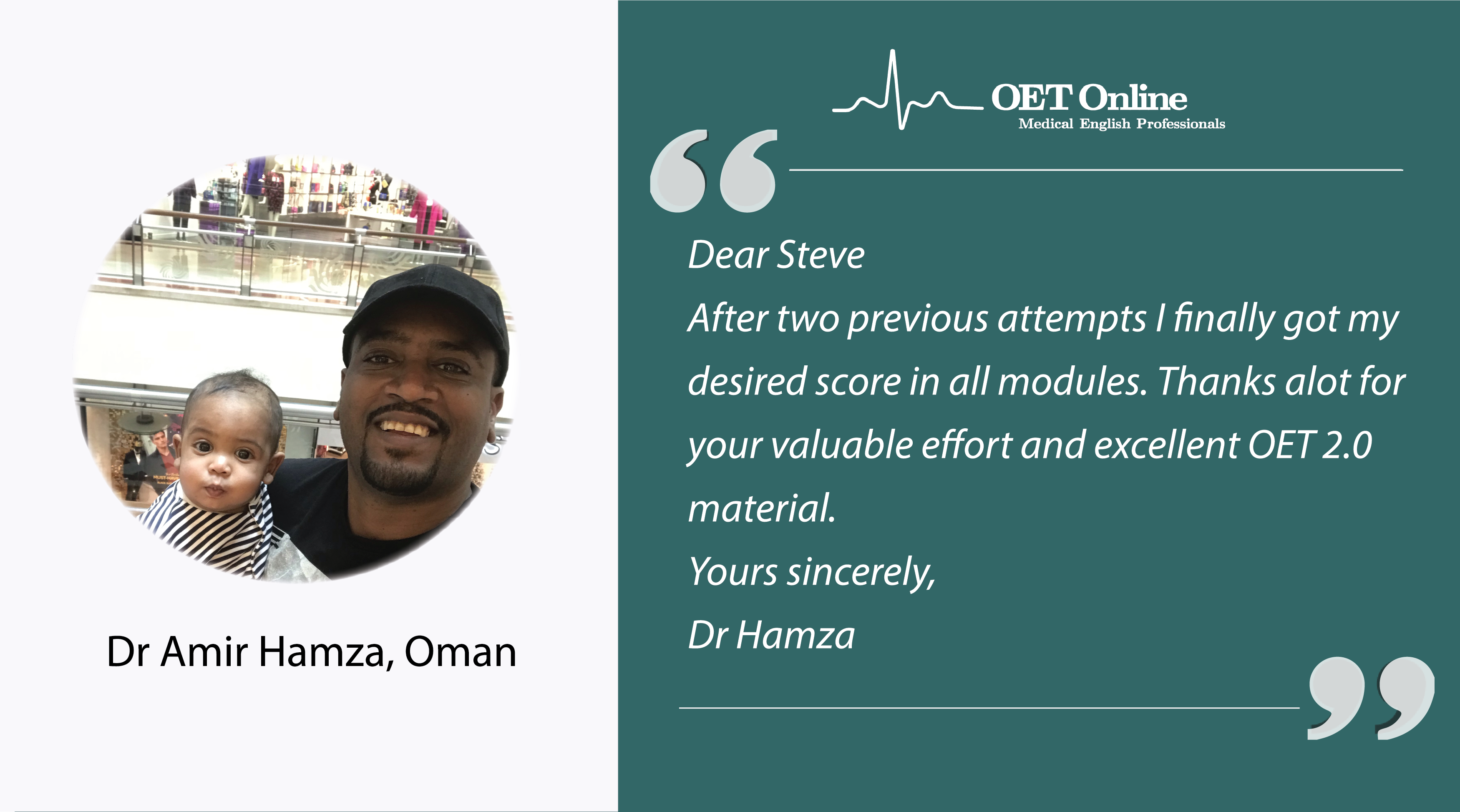 I have passed the exam with a big B in reading, thank you very much for your efforts, support and guidance. You are such a wonderful and great team. Your lessons & teaching strategies were very helpful. I appreciate your help & support. In addition, I strongly recommend Steve, Glenn and OETONLINE team to pass OET test.