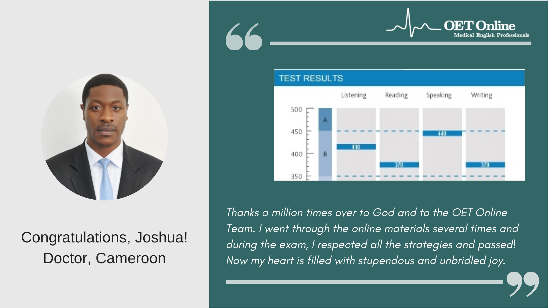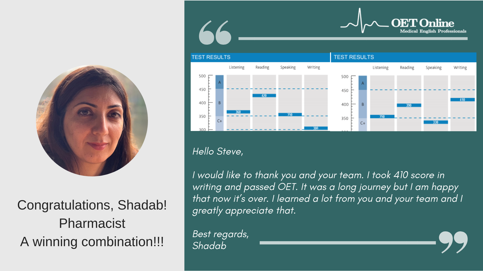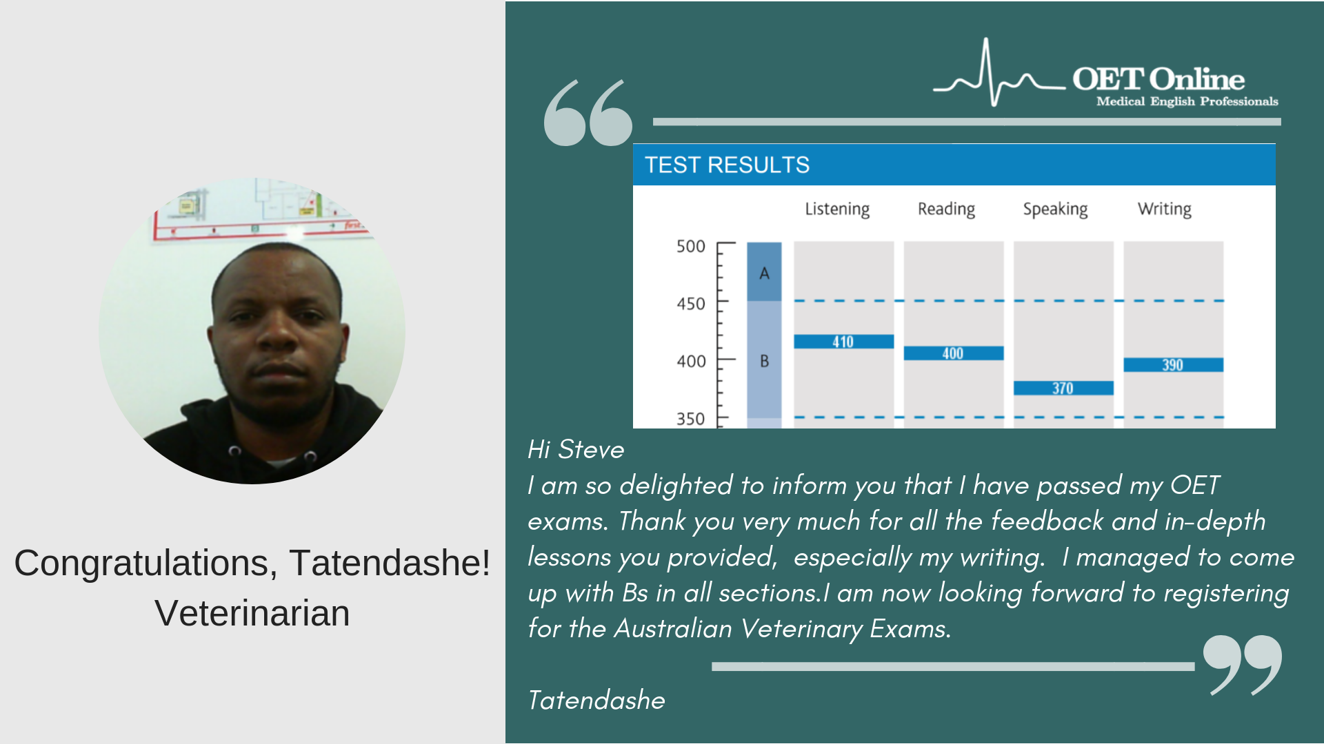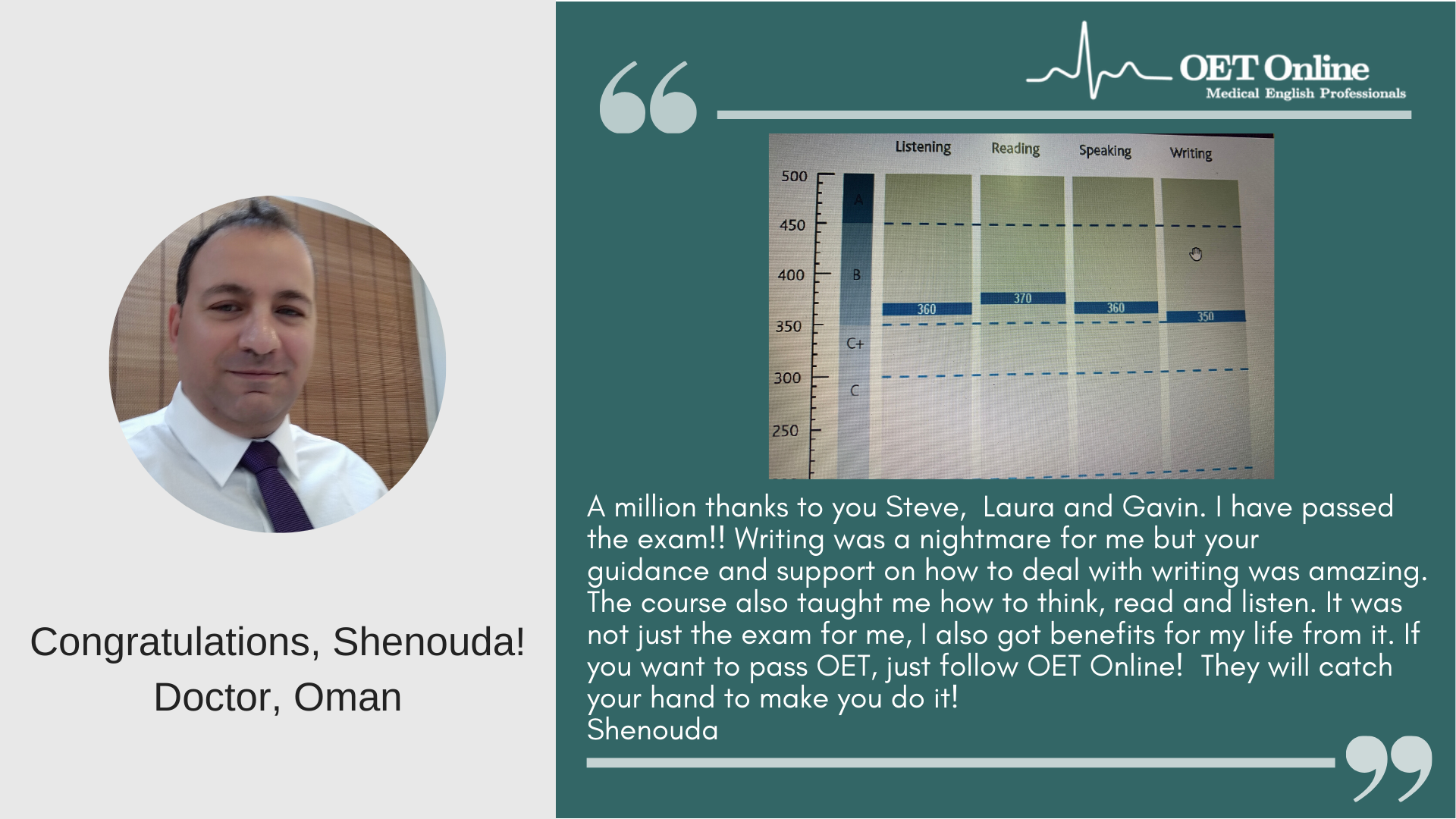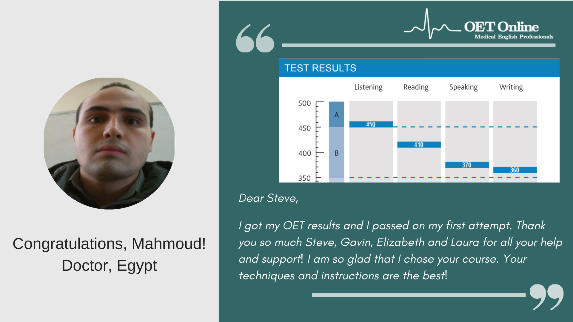 This is to gladly inform you that I passed my OET test (April 14). I scored a B grade for Listening, Speaking, Writing, and a C+ for Reading. I strongly believe that I wouldn't have made this success without your (Steven, Glenn and Elizabeth) support and guidance. My sincere thanks to all of you for helping me to achieve this result. I would say OET Online is an incredible institution which can guide the OET students to achieve the best results in the OET examination. Thank you so much again.