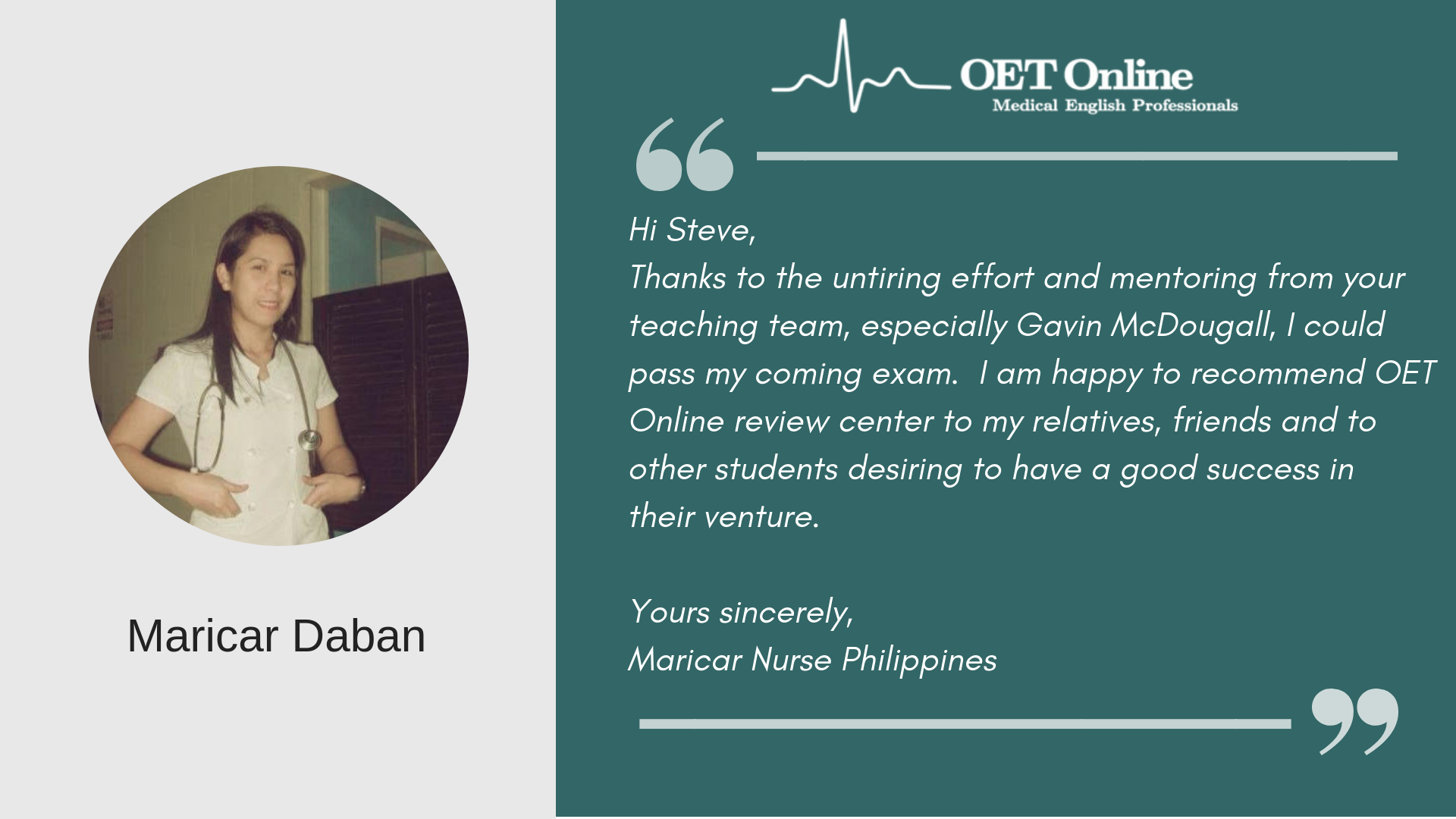 I am so happy to pass the exam and it is my first time to take it. I am very lucky to have found a very reliable and very up to date review center. I followed all your tips and studied all the online materials and it was all worth it because I passed the exam. I never have any idea about OET until I met Steve and Glenn, you are such wonderful teachers and I learned a lot from your lectures.